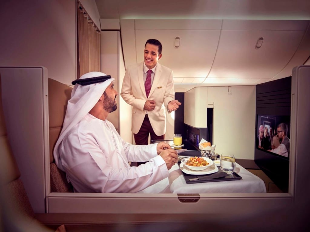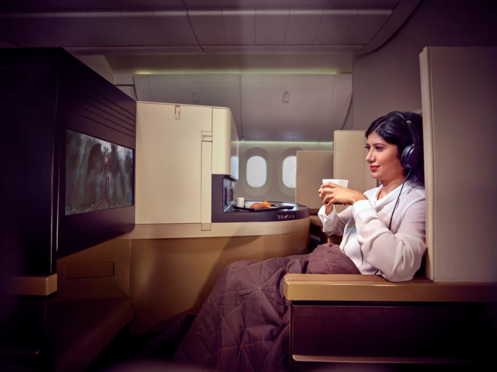 Twoją kabiną biznes zostaniesz zaprowadzony przez osobistego stewarda lub stewardessę. Jeśli lecisz Boeingiem 787-9 lub Airbus A380, spróbujesz wspomnianego Business Studio z układem siedzeń 1-2-1.